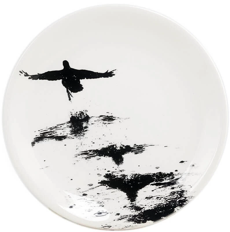De dierenfoto’s van Georges Carillo verfraaien het nieuwe servies van de collectie Chambord en benadrukken de natuur van Sologne. De combinatie van zwart en wit geeft charme en koninklijkheid aan dit tijdloze van aardewerk gemaakte tafelservies. Het bordje beeldt de dieren in het bos af en deze eend lijkt bewegend afgebeeld, geaccentueerd met een zwart handgeschilderd draad. Het gebaksbord heeft een diameter van 17 cm.