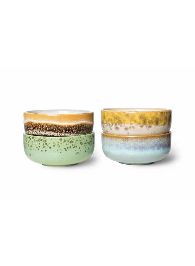 De 70’s castor schaaltjes set van HK Living bestaat uit vier schaaltjes in diverse kleuren. De schaaltjes zijn rond en hebben een diameter van 8,3 cm en een hoogte van 4 cm. De schaaltjes zijn ideaal voor het serveren van kleine hapjes en passen bij de op de planeten geinspireerde servieslijn van HK living.