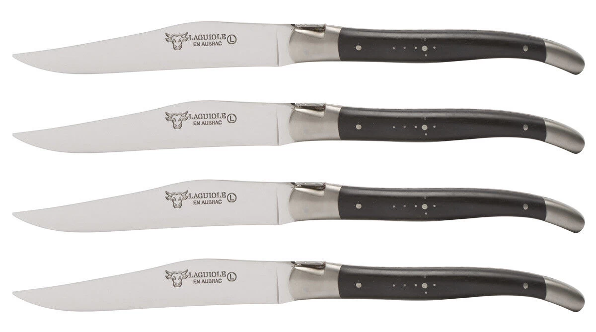 De Laguiole en Aubrac steakmessenset bestaat uit 4 messen met een messenstalen lemmet van 11,5 cm. Het totale mes heeft een lengte van 23 cm. Het heft van het mes is van donkerbruin ebbenhout. U gebruikt het steakmes met de gladde snede voor het snijden van bereid vlees aan tafel.