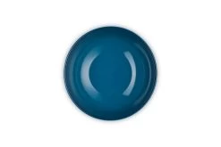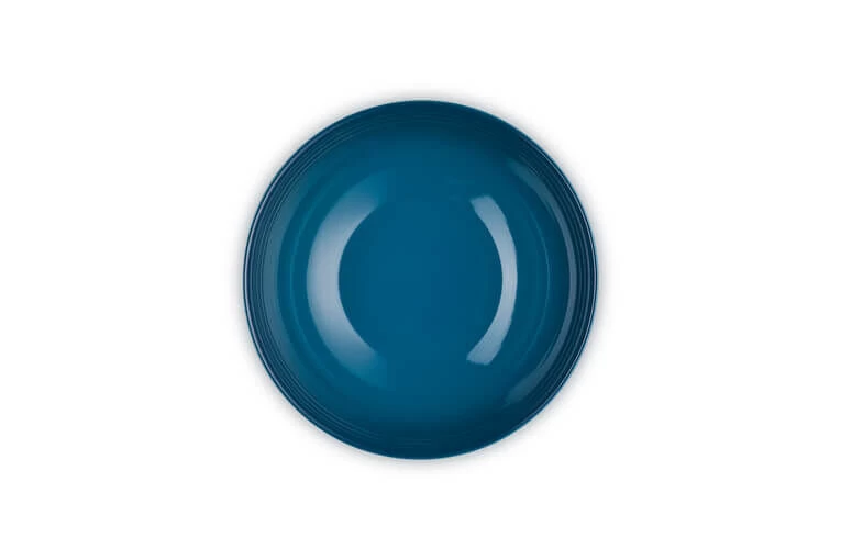 De ronde schaal van Le Creuset is gemaakt van deep teal, donker groenblauw, geglazuurd aardewerk. De diameter van de schaal is 24 cm en heeft een inhoud van 2,2 liter. Gebruik de schaal om bijvoorbeeld een salade in te serveren.