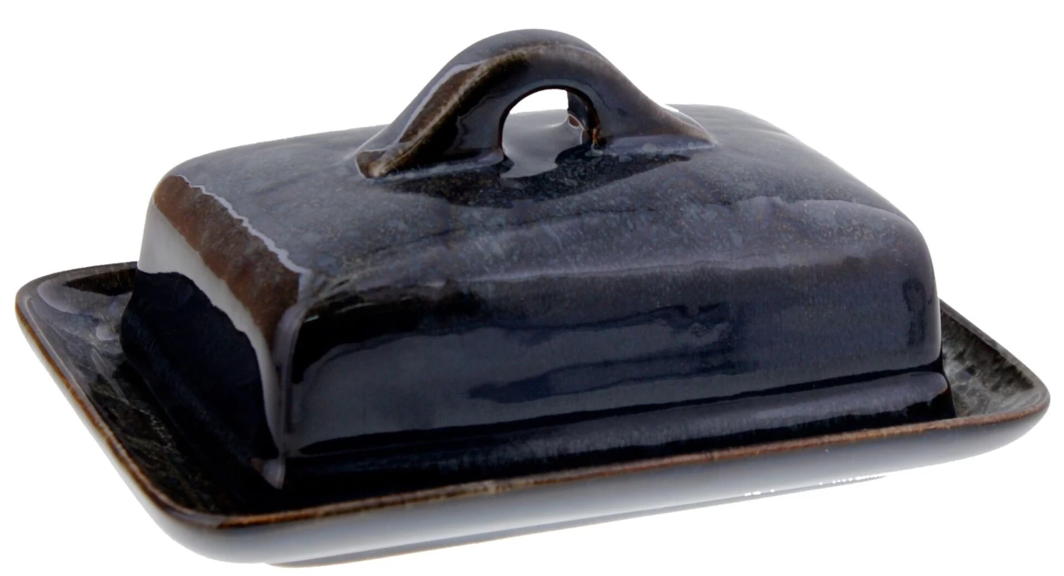 De rechthoekige botervloot van Oldenhof 1821 is gemaakt van spikkelblauw, geglazuurd aardewerk. De botervloot bestaat uit een lage schaal en een hoge deksel. Gebruik de botervloot om boter te bewaren en te serveren.