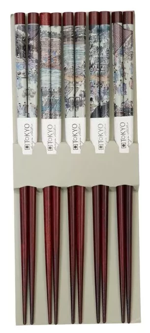 De Oldenhof eetstokjes zijn gemaakt van donkerbruin hout met een Japans motief en hebben een lengte van 22,5 cm. De stokjes komen in een verpakking met 5 sets van 2 eetstokjes. Gebruik de eetstokjes voor het eten van Aziatische gerechten als sushi of noedels.