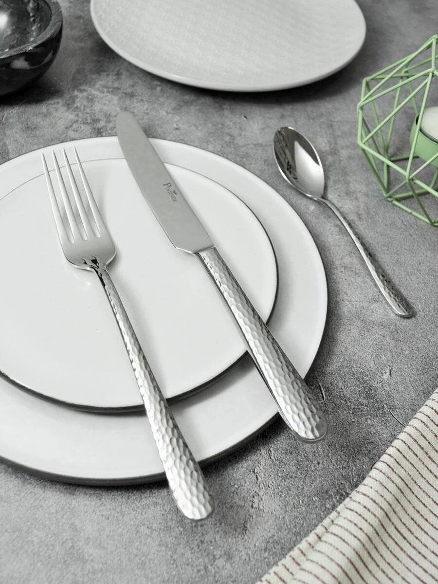 De Pintinox Luna bestekcassette bestaat uit 24 delen en is hiermee geschikt voor 6 personen. Het bestek is vervaardigd uit hoogwaardig, 3 mm dik, 18/10 roestvrij staal. De grepen van het bestek zijn gehamerd voor een speels effect en doet hiermee denken aan het oppervlak van de maan.Gebruik het bestek dagelijks voor diverse maaltijden.